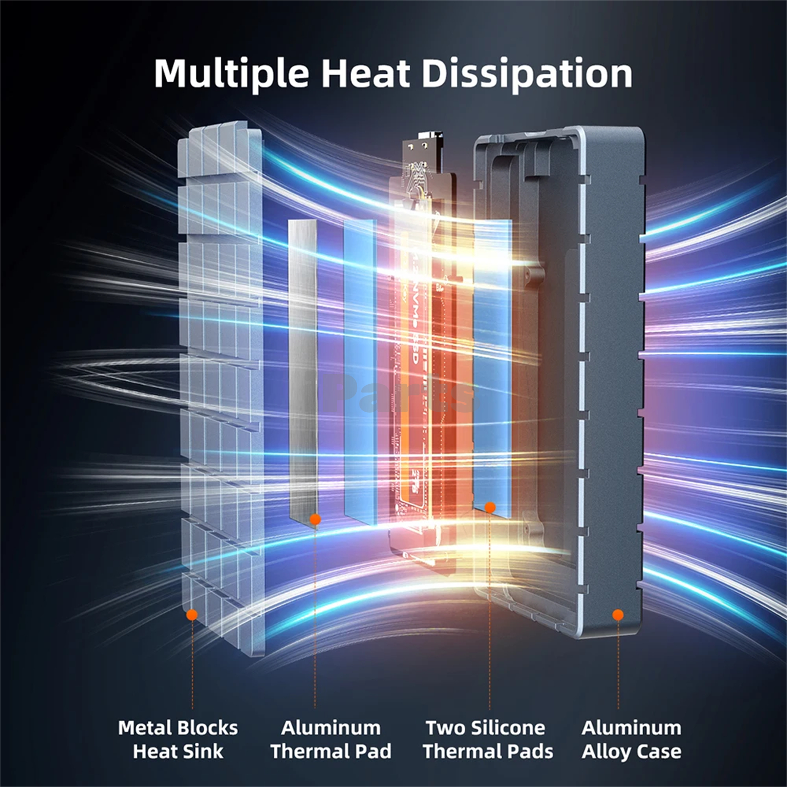 40Gbps transfer speeds with this USB4.0 M.2 NVMe SSD Enclosure, supporting up to 8TB SSD and compatible with Thunderbolt 4, USB3.2, Mac OS, Windows, Linux, and Android. Featuring dual silicon thermal pads, a heat-conductive aluminum plate, and tool-free installation for efficient heat dissipation and durability. Made from high-strength aluminum alloy with an anodic oxidation process for a luxury feel.